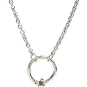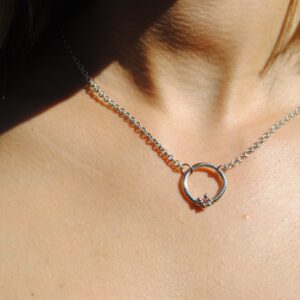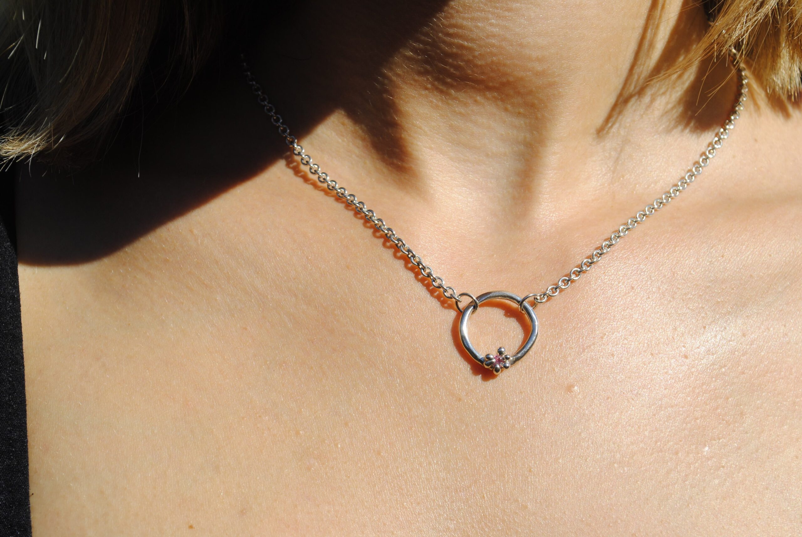 This elegant sterling silver necklace features a unique handcrafted circle pendant. accented with a cast-in-place pink sapphire. The circle’s organic form gives a natural. pebble-like texture. while the small flower-like prongs securely hold the sapphire. adding a delicate. subtle pop of color. Suspended from a durable. polished silver chain. this piece is a versatile addition to any jewelry collection. perfect for both everyday wear and special occasions.