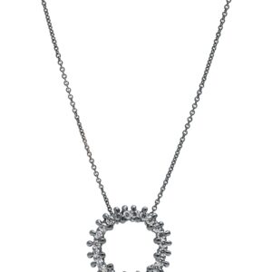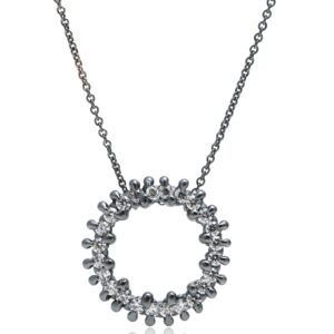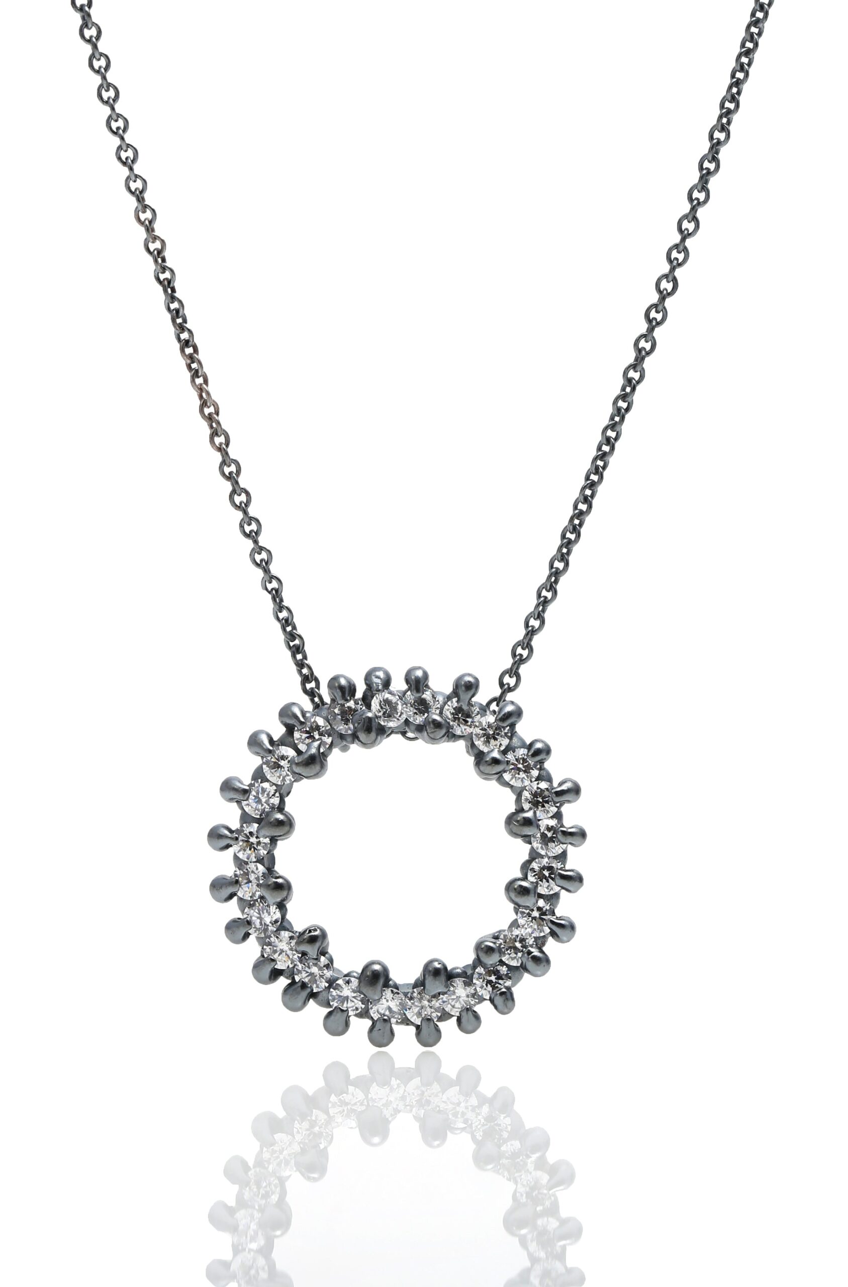 Bright. bold. and beautifully textured—this halo pendant features 24 cast-in-place white sapphires. fused directly into molten silver for a seamless. organic surface. The oxidized finish adds contrast and depth. making the sapphires sparkle even more brilliantly against the darkened silver.