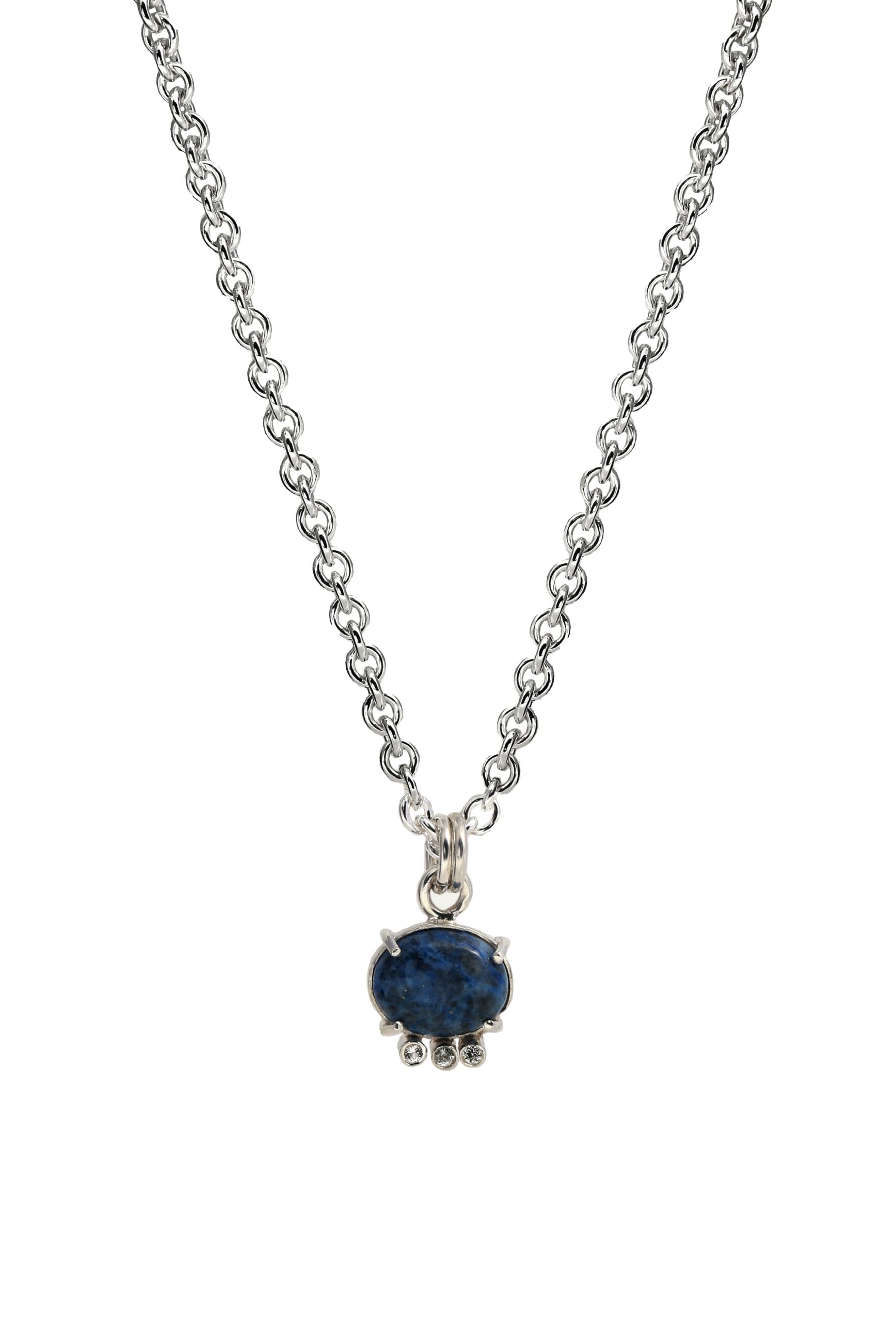 A celestial addition to the Starfall Collection. this pendant captures the mystery of the night sky in rich sodalite and radiant white topaz. Set in recycled sterling silver and suspended from a 16" cable chain. it’s a piece that reflects light and depth—like a falling star cutting through darkness.